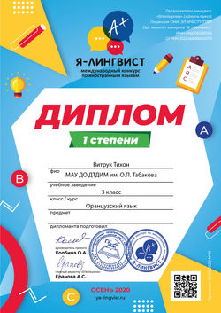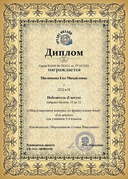 Результатом участия в конкурсе «Les articles» стало получение наградных документов сразу после прохождения опроса: диплом Победителя I место – Кузьмина Анфиса (10 из 10 возможных баллов!) и Христов Демид (9 из 10), диплом победителя III место – Логоша Алиса.