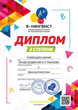 Лодянова Елизавета (6 класс) - Дипломом победителя I степени за билингвальное прочтение и видеозапись отрывка "Размышления Наташи Ростовой о счастье", (Л.Н. Толстой «Война и мир»);