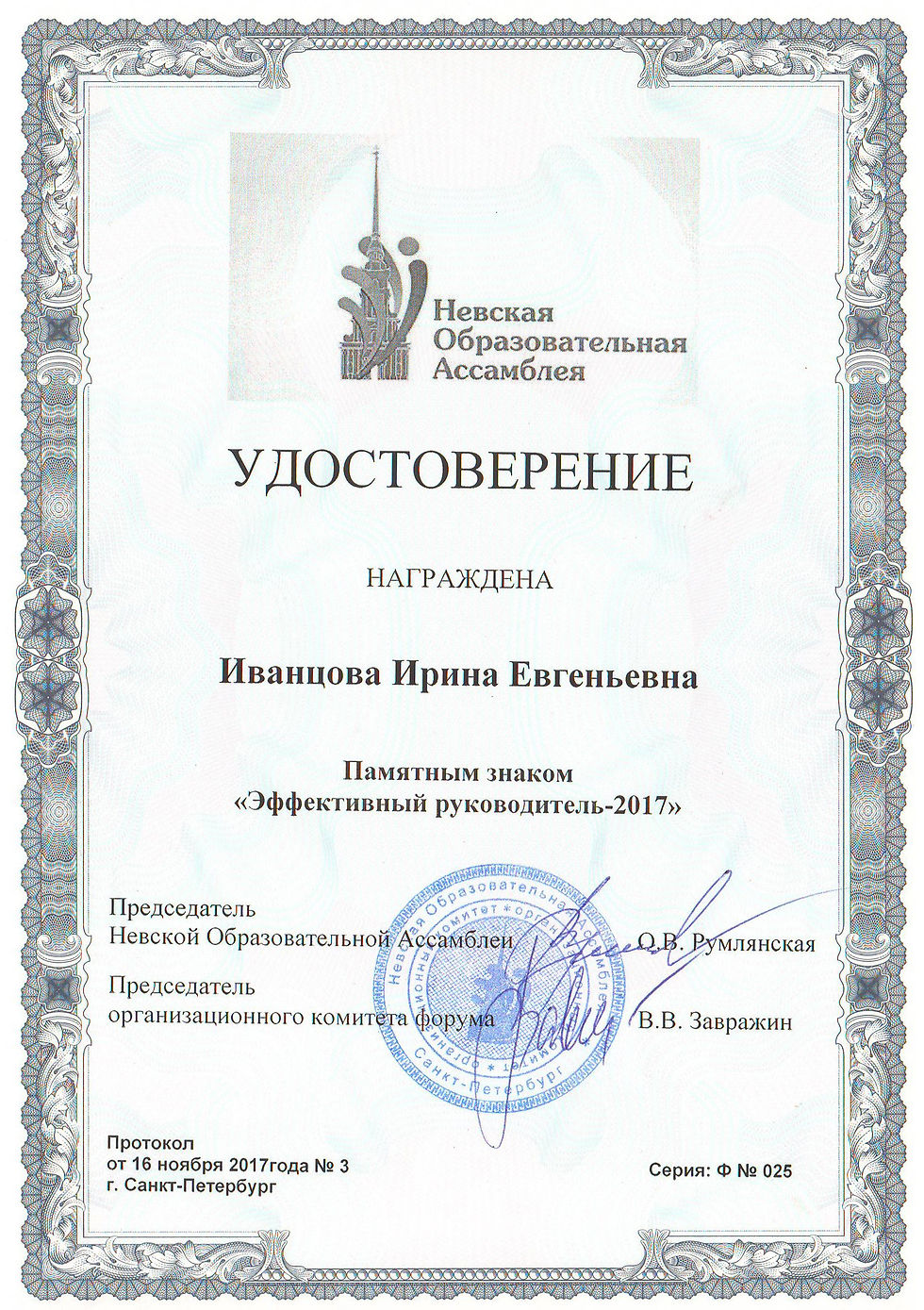 Директор Иванцова Ирина Евгеньевна признана "Эффективным руководителем - 2017" и награждена Почетным знаком.