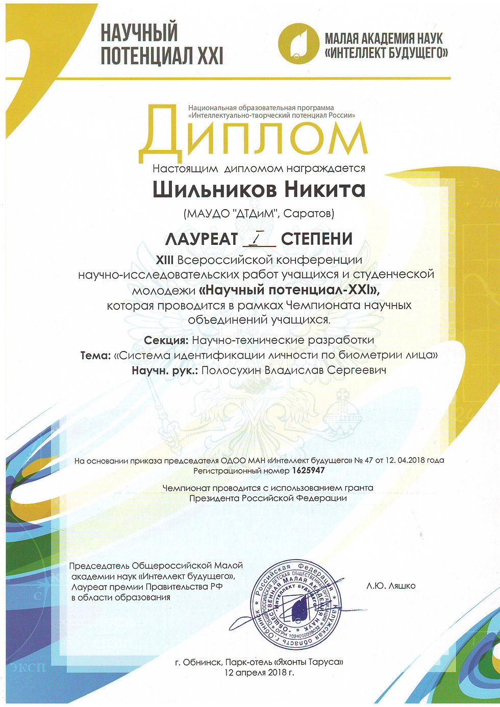 Одновременно с конференцией «Научный потенциал» проходил Национальный чемпионат научных объединений учащихся. Наши ребята очень достойно выступили на секции «Научно-технические разработки» с темой «Система идентификации личности по биометрии лица» и получили дипломы лауреатов I степени. Буклушин Кирилл и Шильников Никита стали лучшими среди лучших.