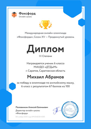 участие в Международной онлайн - олимпиаде "Фоксфорда";, сезон