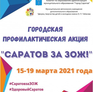 С 15 по 19 марта 2021 года в рамках городской профилактической акции «Саратов за ЗОЖ!» представители школьных волонтерских отрядов Саратова организовали и провели более 100 мероприятий, посвященных формированию бережного отношения к своему здоровью и положительной мотивации к выбору здорового образа жизни.